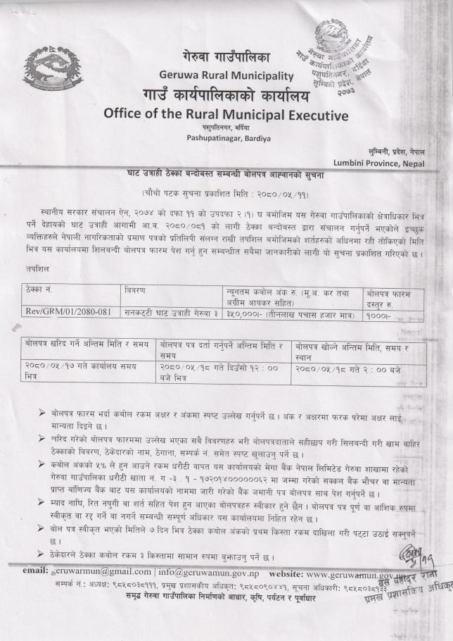 घाट उत्राही ठेक्का बन्दोबस्त सम्बन्धी बोलपत्र आह्वानको सूचना