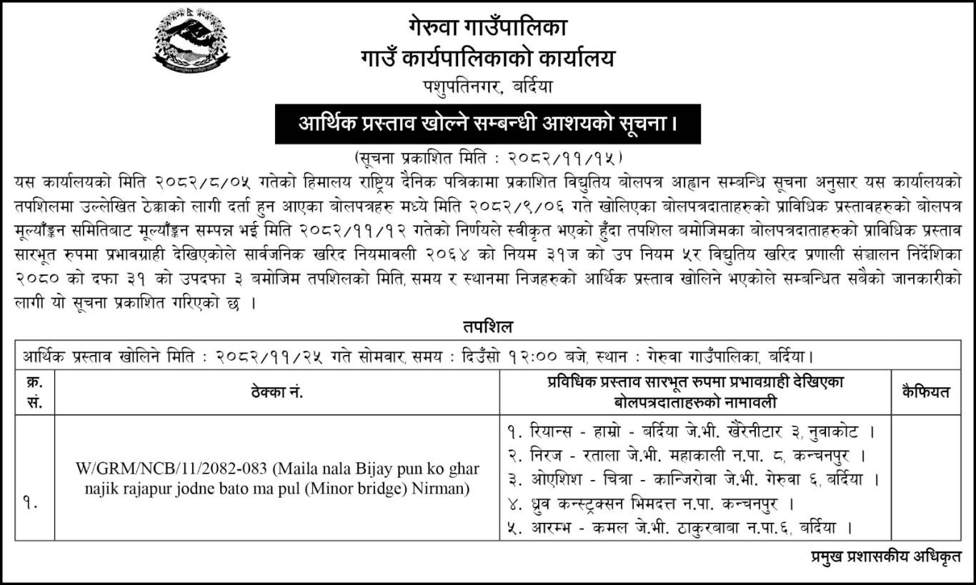 आर्थिक प्रस्ताव खोल्ने सम्बन्धि आशयको सूचना