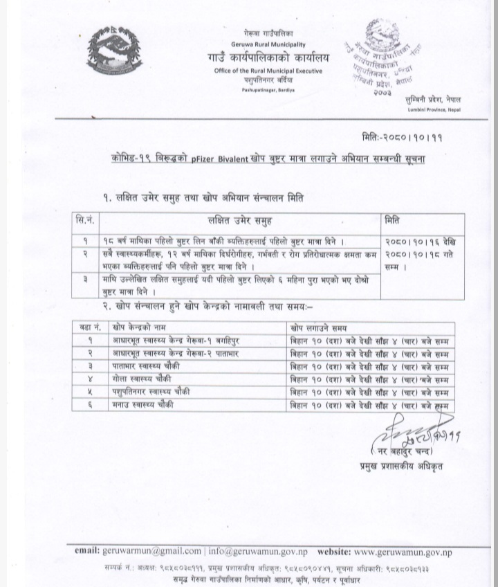 कोभिड १९ विरुद्धको pFizer Bivalent खोप अभियान संचालन सम्बन्धमा ।