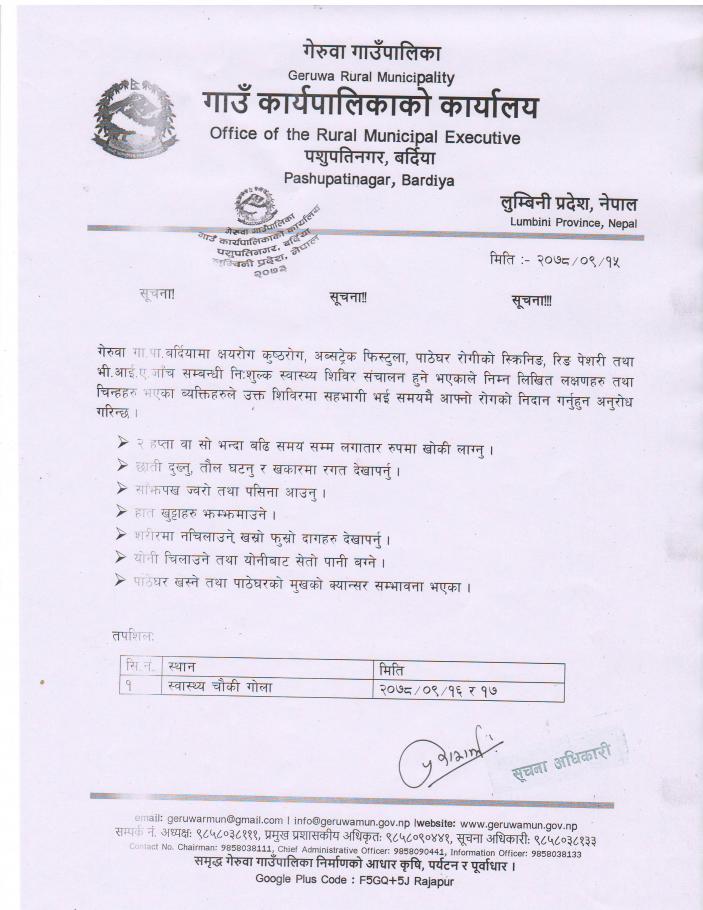 गेरुवा गा.पा. बर्दियमा क्षयराेग कुष्ठराेग,अब्सट्रेक फिस्टुला, पाठेघर रोगीको स्क्रिनिङ, रिङ पेशरी तथा भी.आई.ए.जाँच सम्बन्धी निःशुल्क स्वास्थ्य शिविर संचालन ।