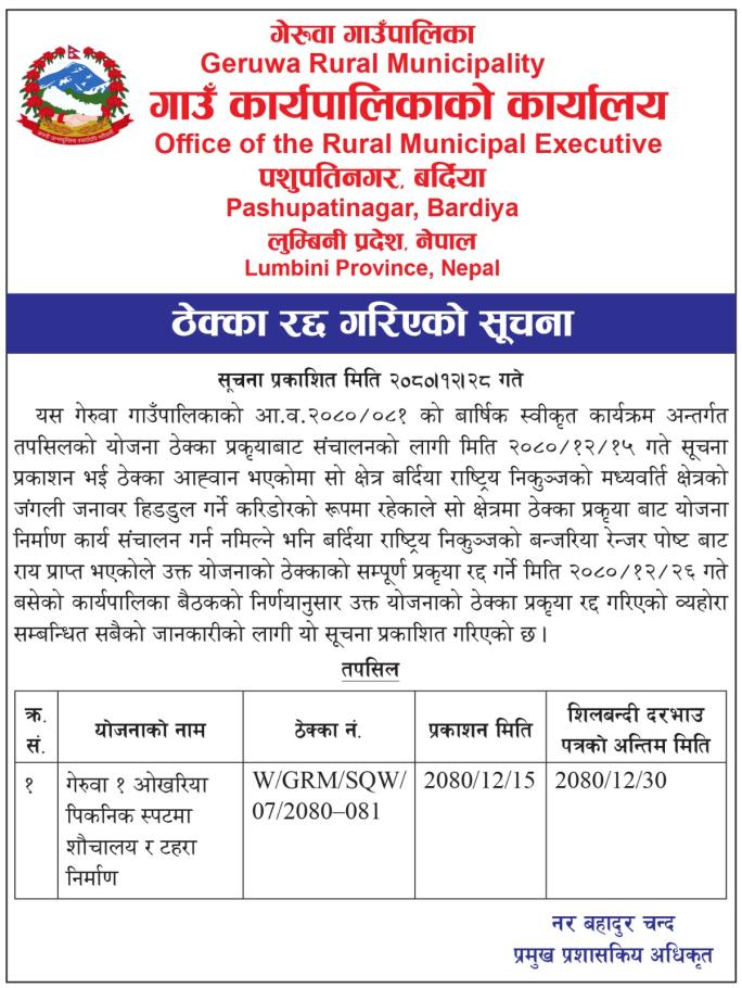 ठेक्का रद्द गरिएको सूचना