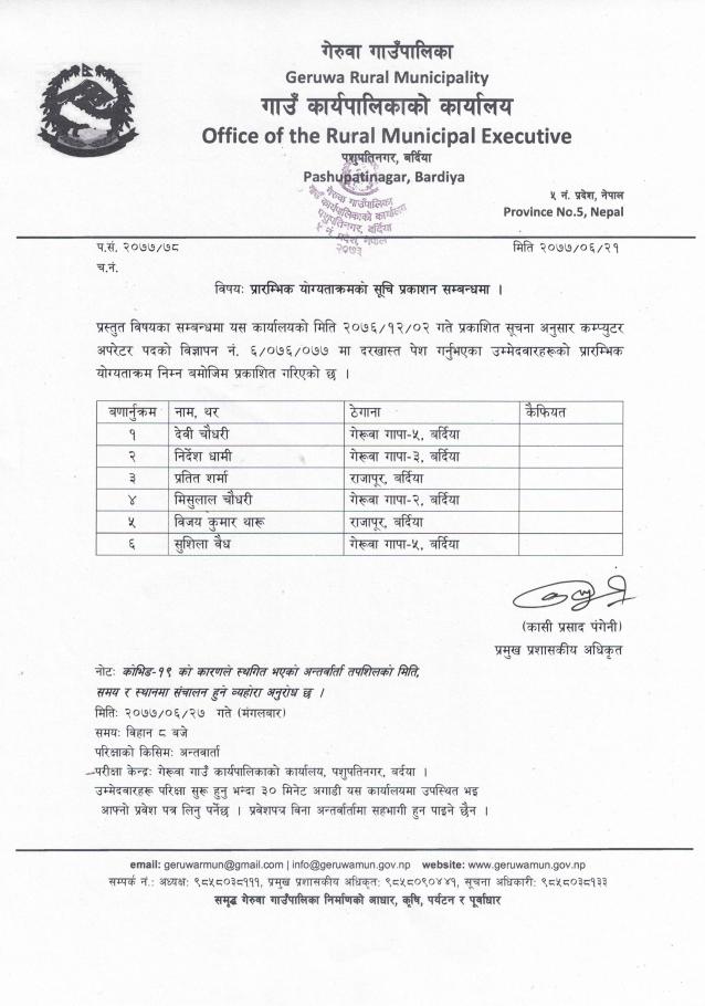 प्रारम्भिक योग्यताक्रमको सूची प्रकाशन सम्बन्धमा ।