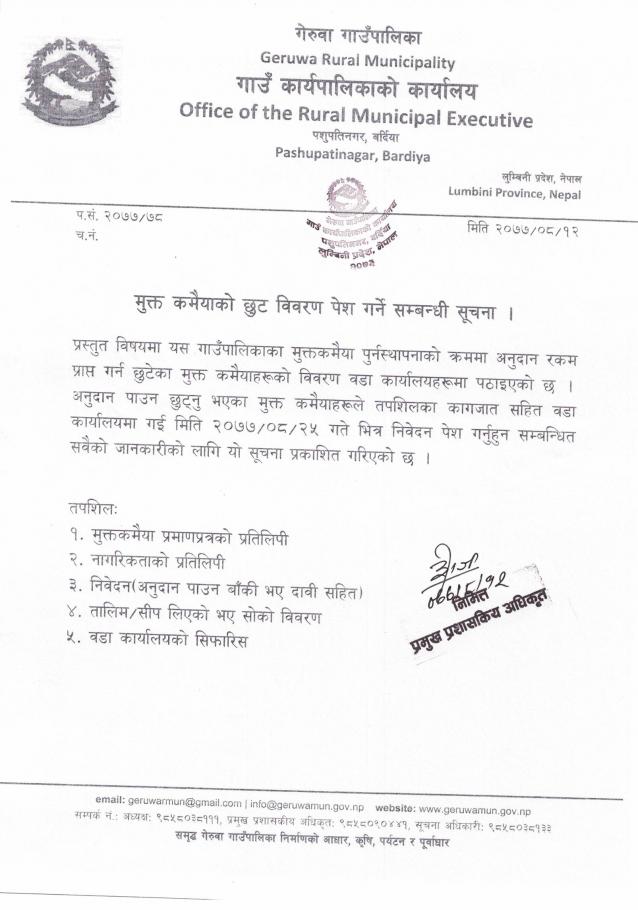 मुक्तकमैयाको अनुदान पाउन छुट विवरण पेश गर्ने सम्बन्धी सूचना ।