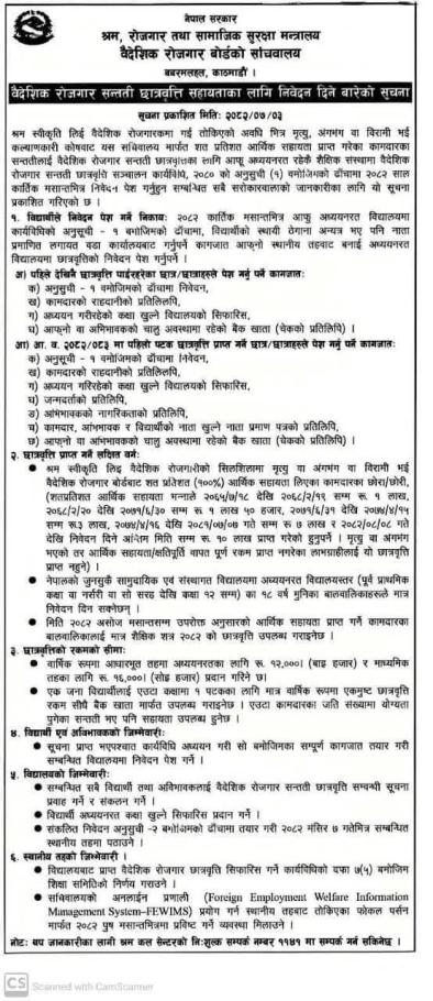 वैदेशिक रोजगारीका क्रममा मृत्यु वा अङ्गभङ्ग भै पूर्ण आर्थिक सहायता प्राप्त गरेका परिवारका सन्ततीका लागि सन्तती छात्रवृत्ति आवेदन खुलाएको छ।