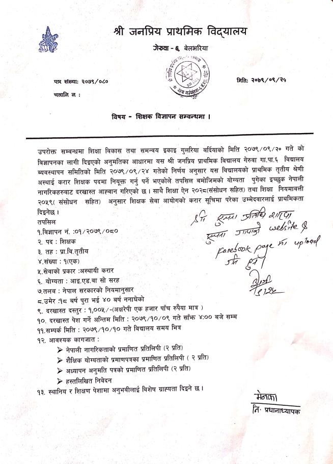 शिक्षक विज्ञापन सम्बन्धमा ।