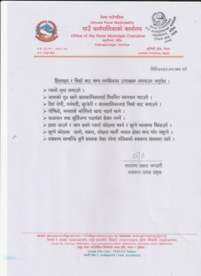 शितलहर र चिसो बाट बच्न तपसिलका उपायहरू अपनाउन अनुरोध ।