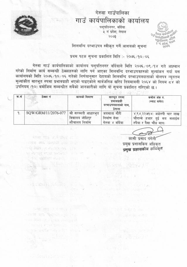 शिलबन्दी दरभाउपत्र स्वीकृत गर्ने आशयको सूचना ।।।