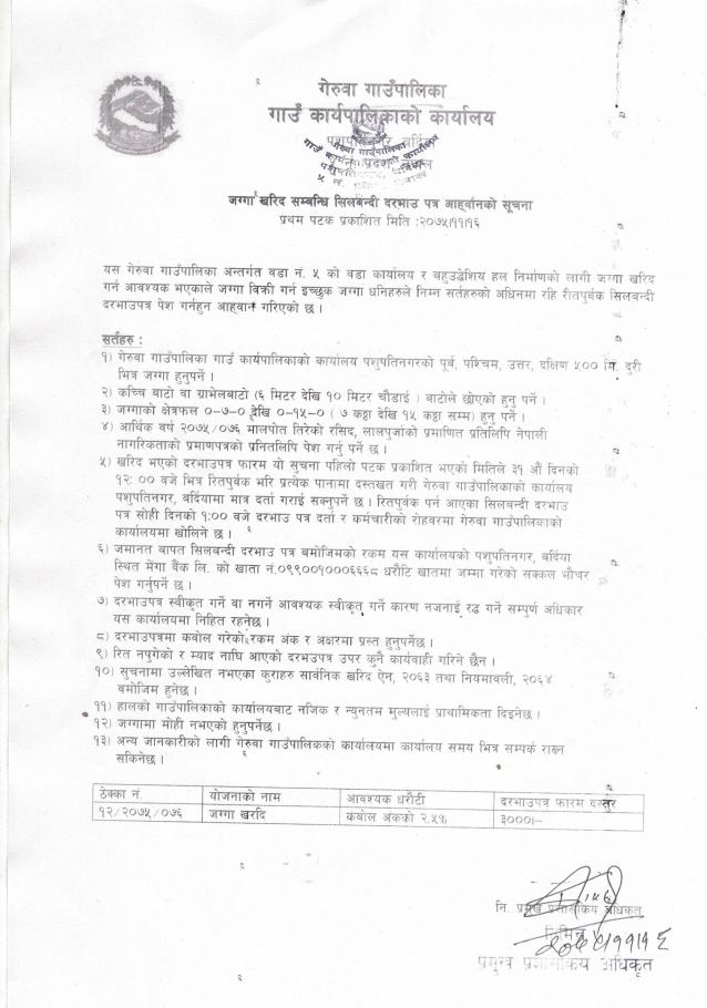 जग्गा खरिद सम्बन्धि सिलबन्दी दरभाउ पत्र अावह्वानको सूचना