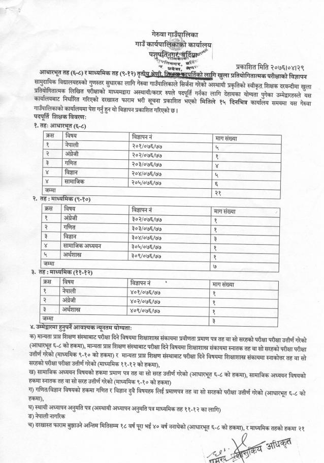 गेरूवा गाउँपालिका बाट शिक्षक पदपूर्तिकाे लागि खुल्ला प्रतियाेगितात्मक परीक्षाकाे विज्ञापन