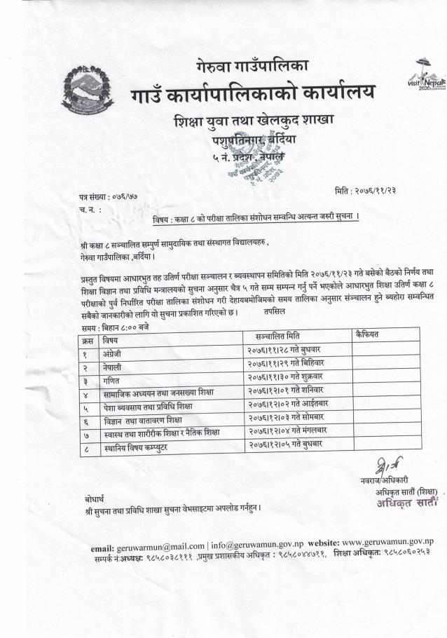 कक्षा ८ काे परीक्षा तालिका संशाेधन सम्बन्धि अत्यन्त जरूरी सुचना ।