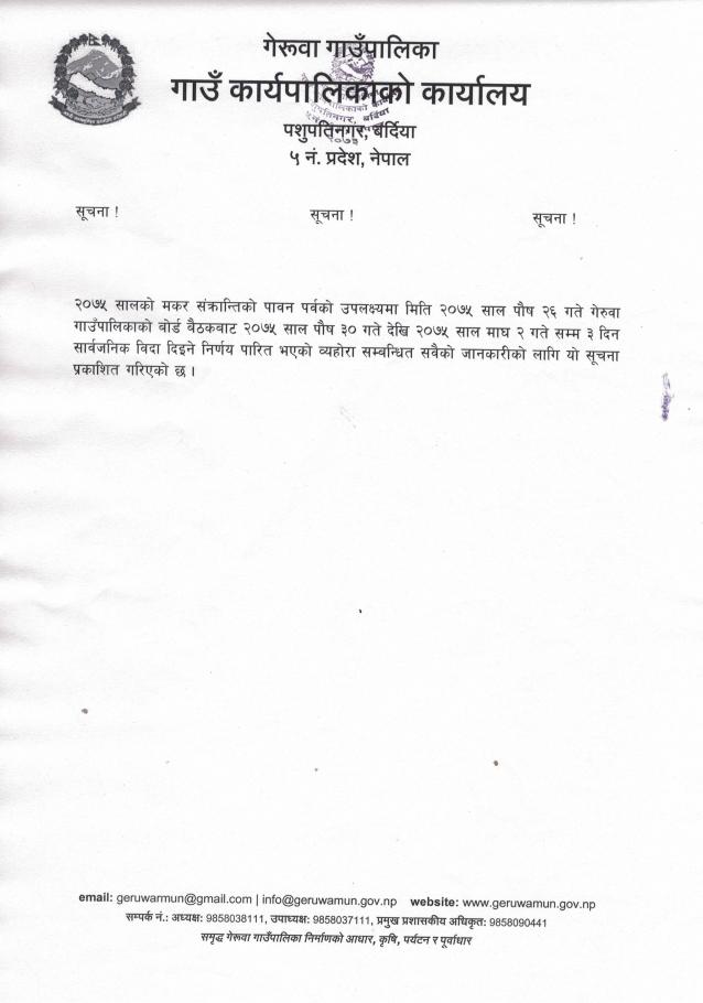 सार्वजनिक विदा सम्बन्धमा गेरूवा गाउँपालिकाको सूचना ।।।