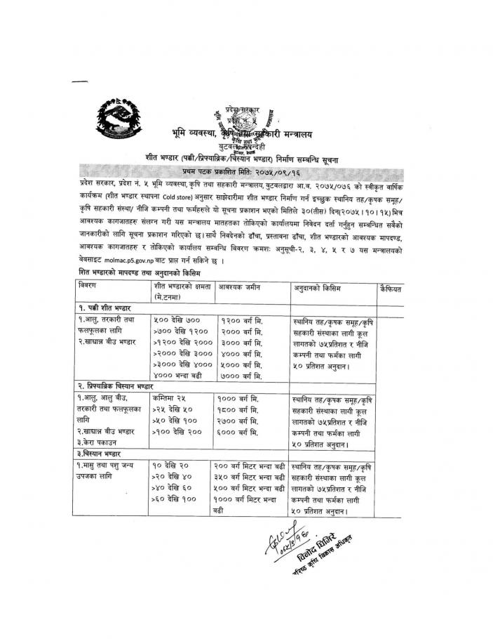 शीत भण्डार निर्माण सम्बन्धी सूचना ।।।