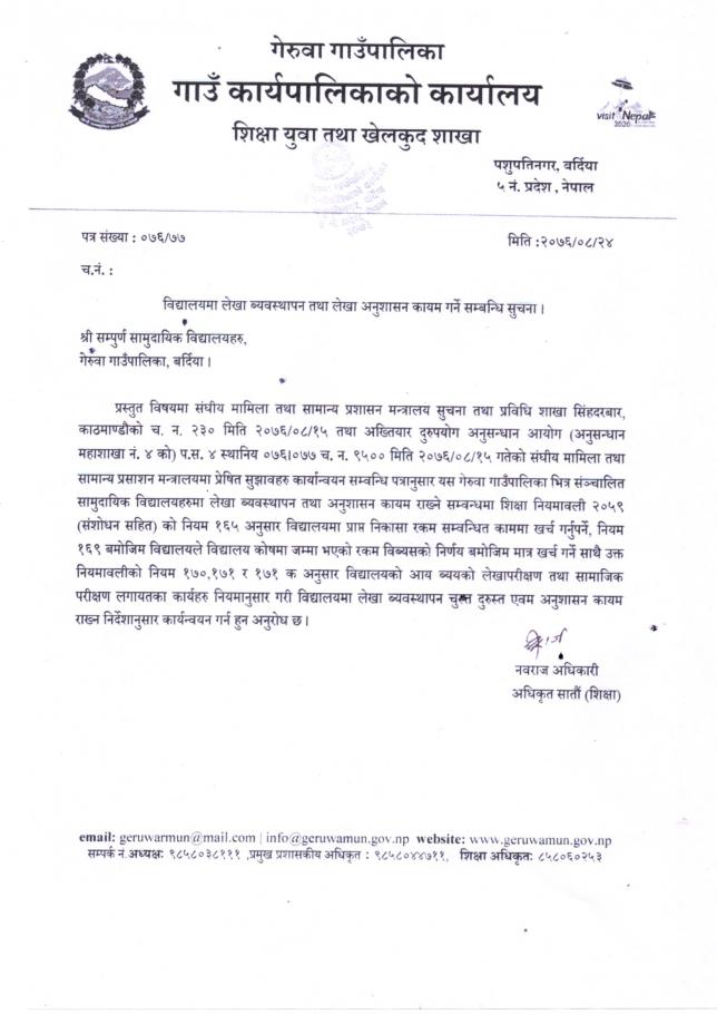 विद्यालयमा लेखा ब्यवस्थापन तथा लेखा अनुशासन कायम गर्ने सम्बन्धी सूचना ।