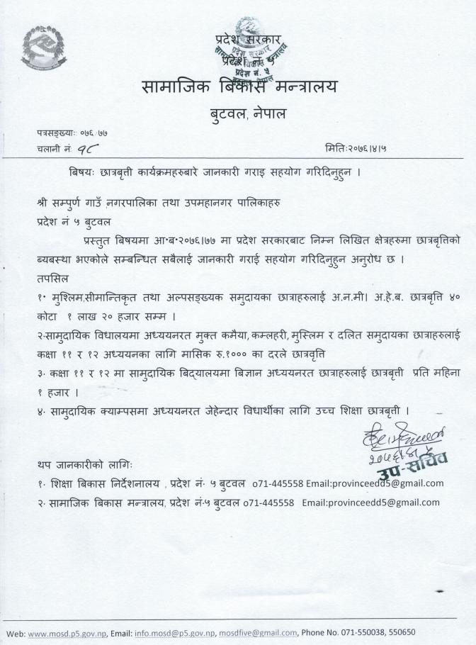छात्रवृत्ति कार्यक्रमहरू बारे सामाजिक विकास मन्त्रालय, प्रदेश नं. ५ को सूचना ।।।